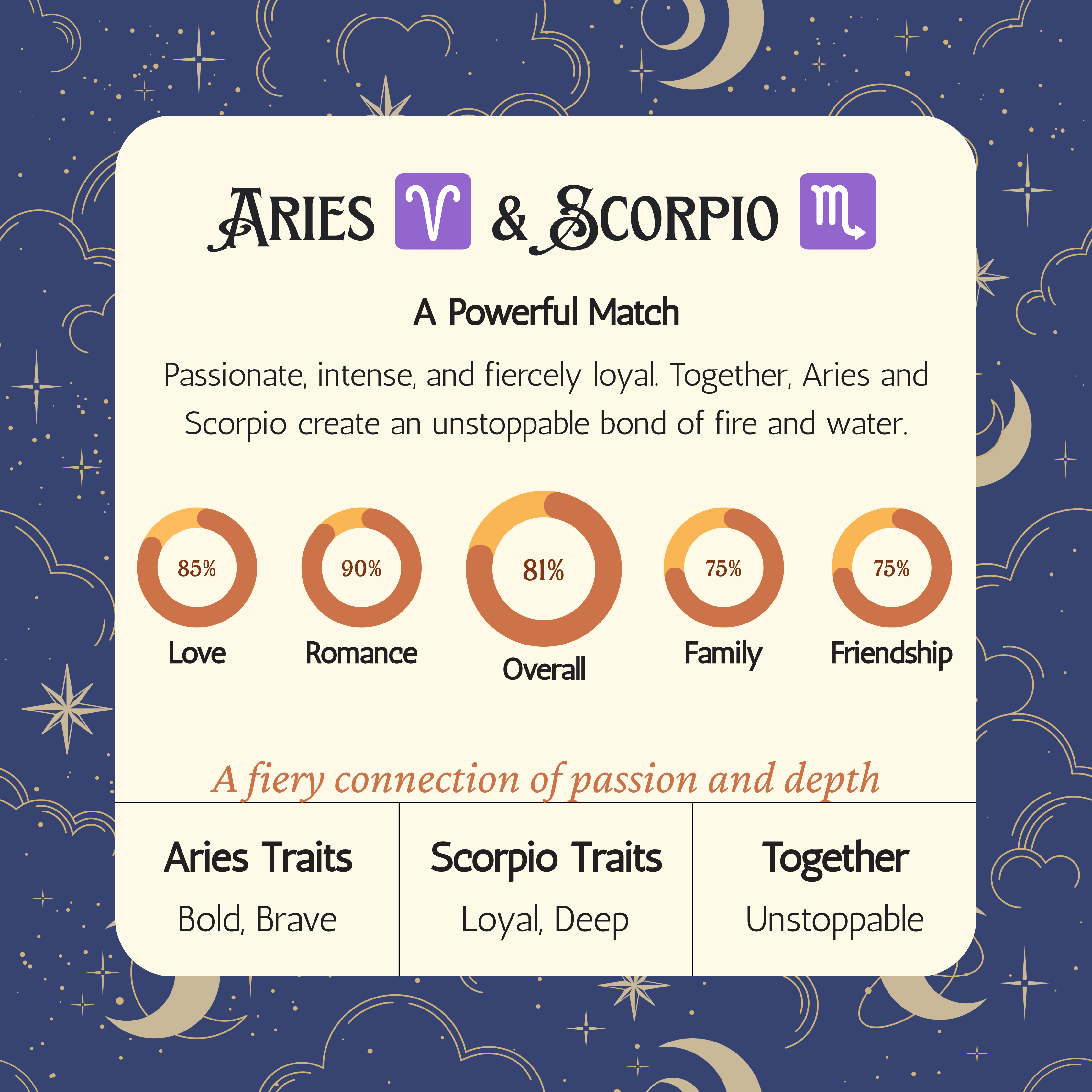 When Aries and Scorpio find that balance, their bond becomes rare. It is passionate, loyal, and deeply transformative. The kind of love that changes both people for the better.