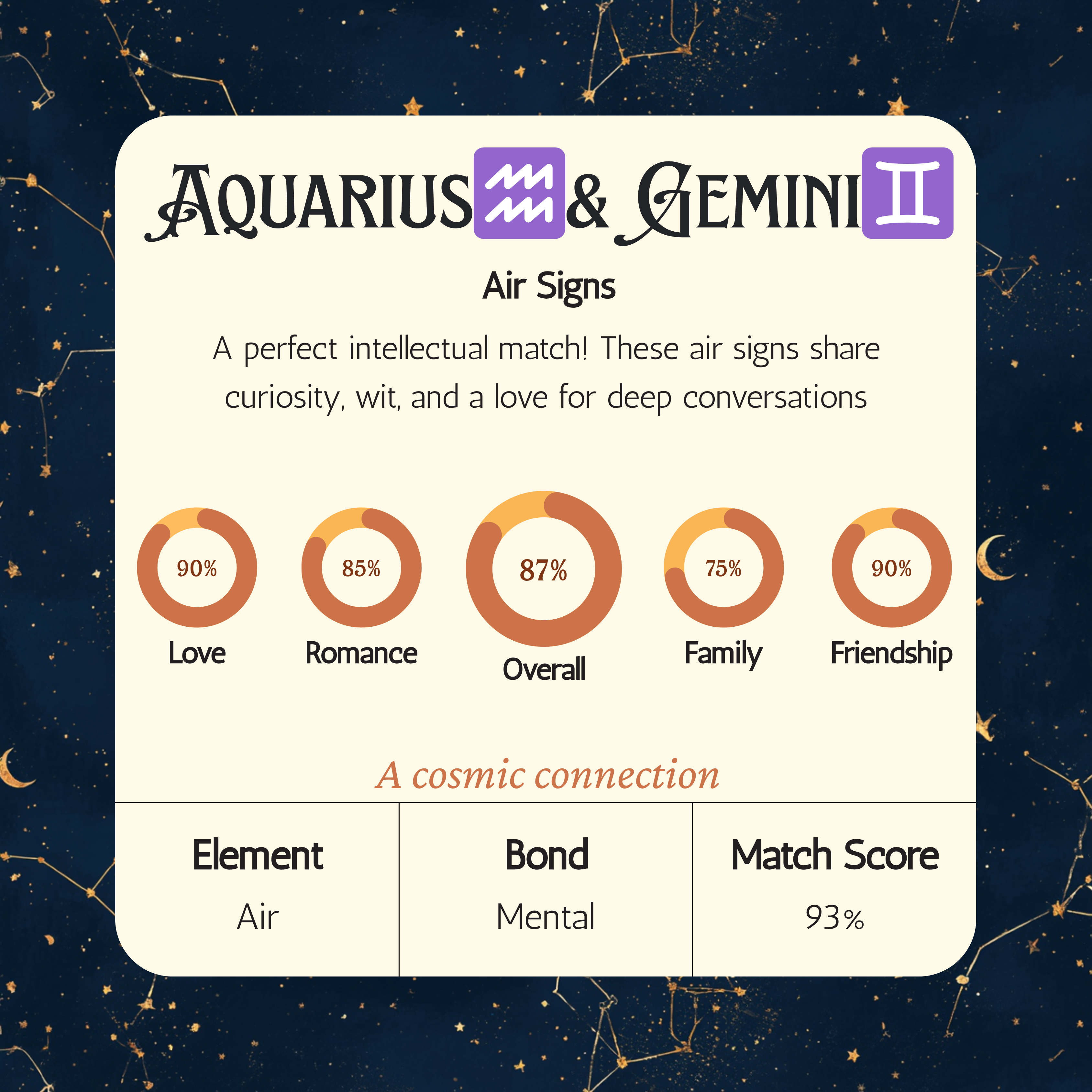 Overall, Aquarius and Gemini share a natural compatibility that is built on understanding, freedom, and intellectual connection. If they manage to stay consistent and grounded, this relationship can turn into something truly lasting.