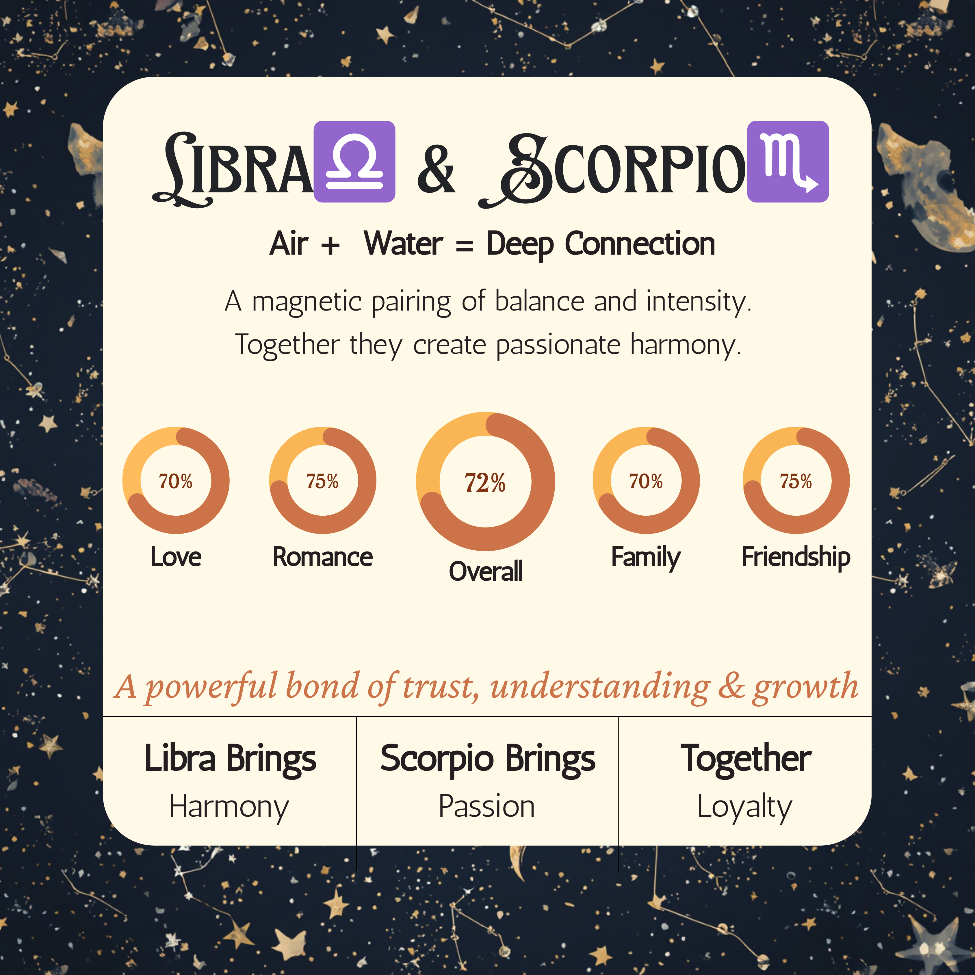 In love, Libra brings charm and romance, while Scorpio brings passion and depth. Together, they create a unique emotional dynamic.